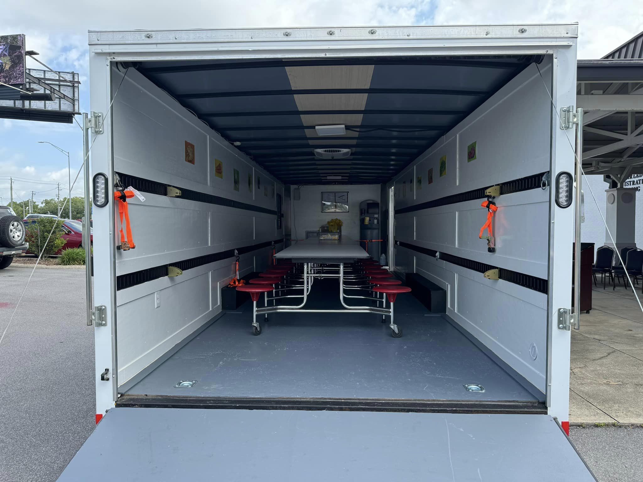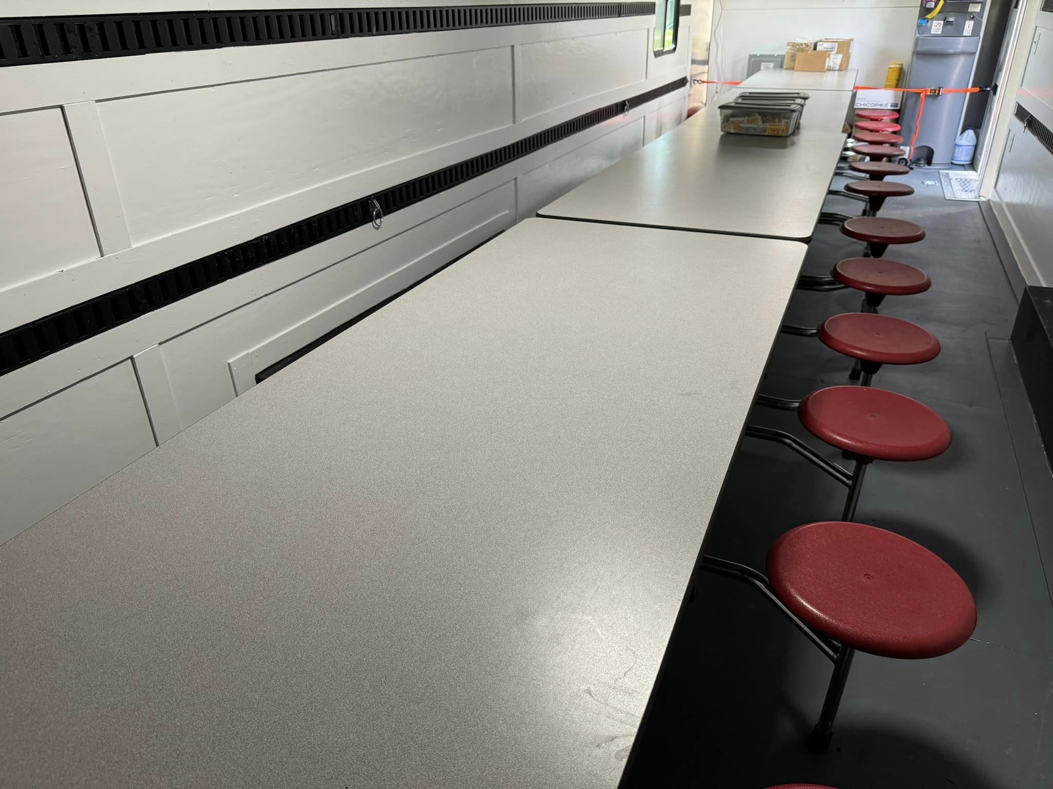 The Mobile Dining Unit is a convenient and efficient way to provide meals to children participating in summer camps or those who face transportation challenges. During the regular school year, the trailer may be used to provide meals for special school events like field trips and field days. The trailer comes equipped with onboard electricity, air conditioning, cafeteria seating, and handwashing stations.
