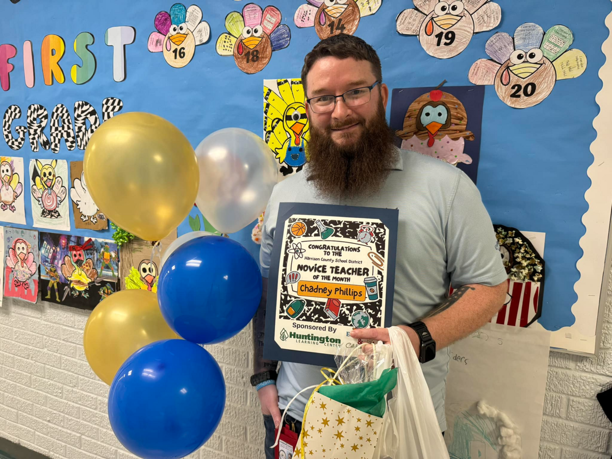 We stopped by the school cafeteria at lunchtime to celebrate Mr. Chadney Phillips, our October District Novice Teacher of the Month drawing winner. Mr. Phillips teaches 5th-grade and 6th-grade science at Pineville. Mr. Phillips received a meal from Mugshots, gift cards, balloons, a certificate, and other goodies. Check out his reaction in the video!