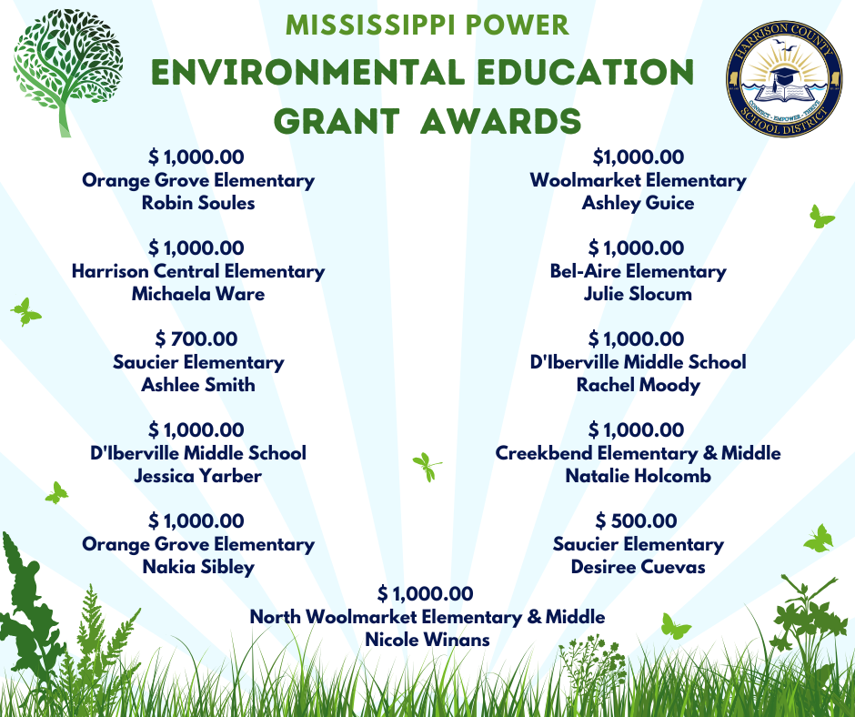 (January 28, 2025)—We want to give a big shoutout to the following HCSD teachers who have been awarded Environmental Education Grants from Mississippi Power!