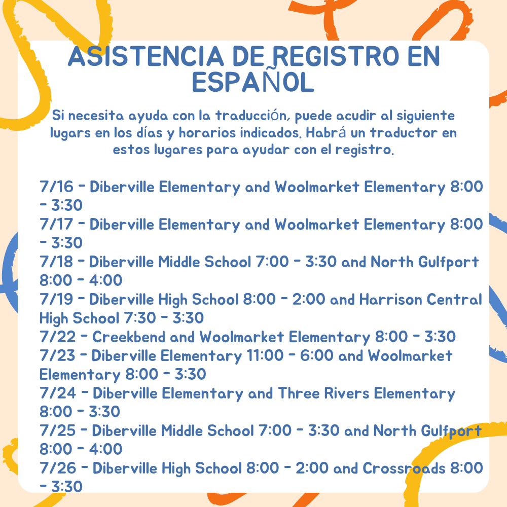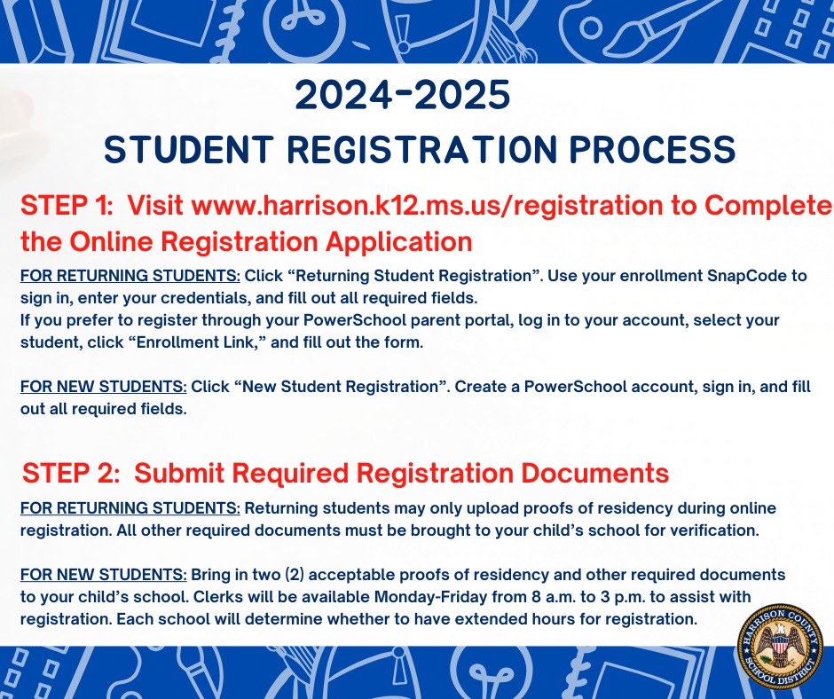 (July 10, 2024) – Online registration for new and returning students for the 2024-25 school year will open on Monday, July 15, and close on July 29! Please see the flyer for important information about the PowerSchool Parent Portal and SnapCodes, Verification of Residency, Immunization and Birth Certificate Requirements, and the registration timeline. Additional registration information can also be found on the HCSD website: https://www.harrison.k12.ms.us/31653_2.