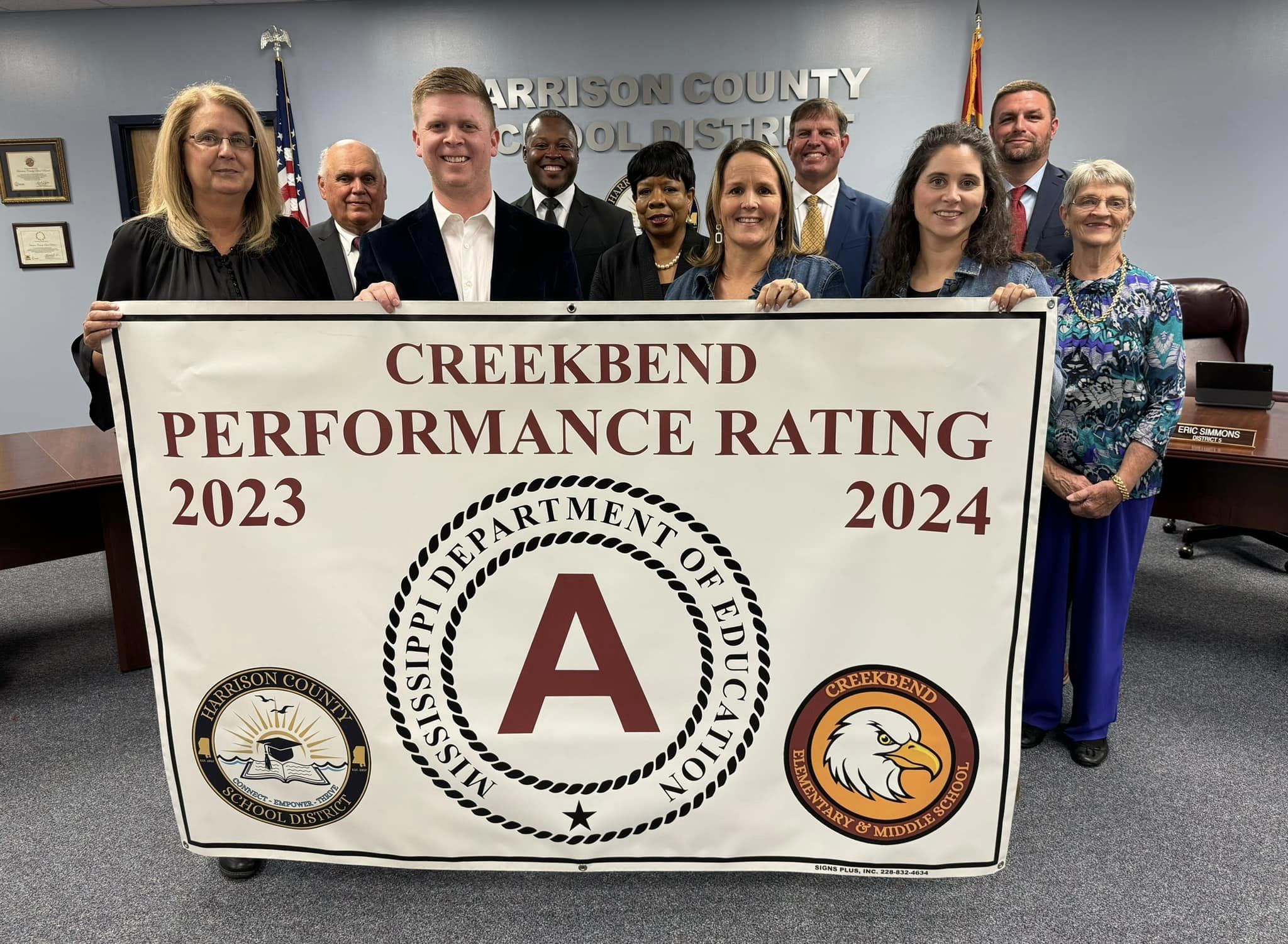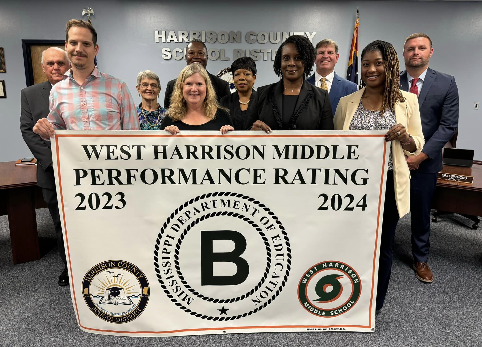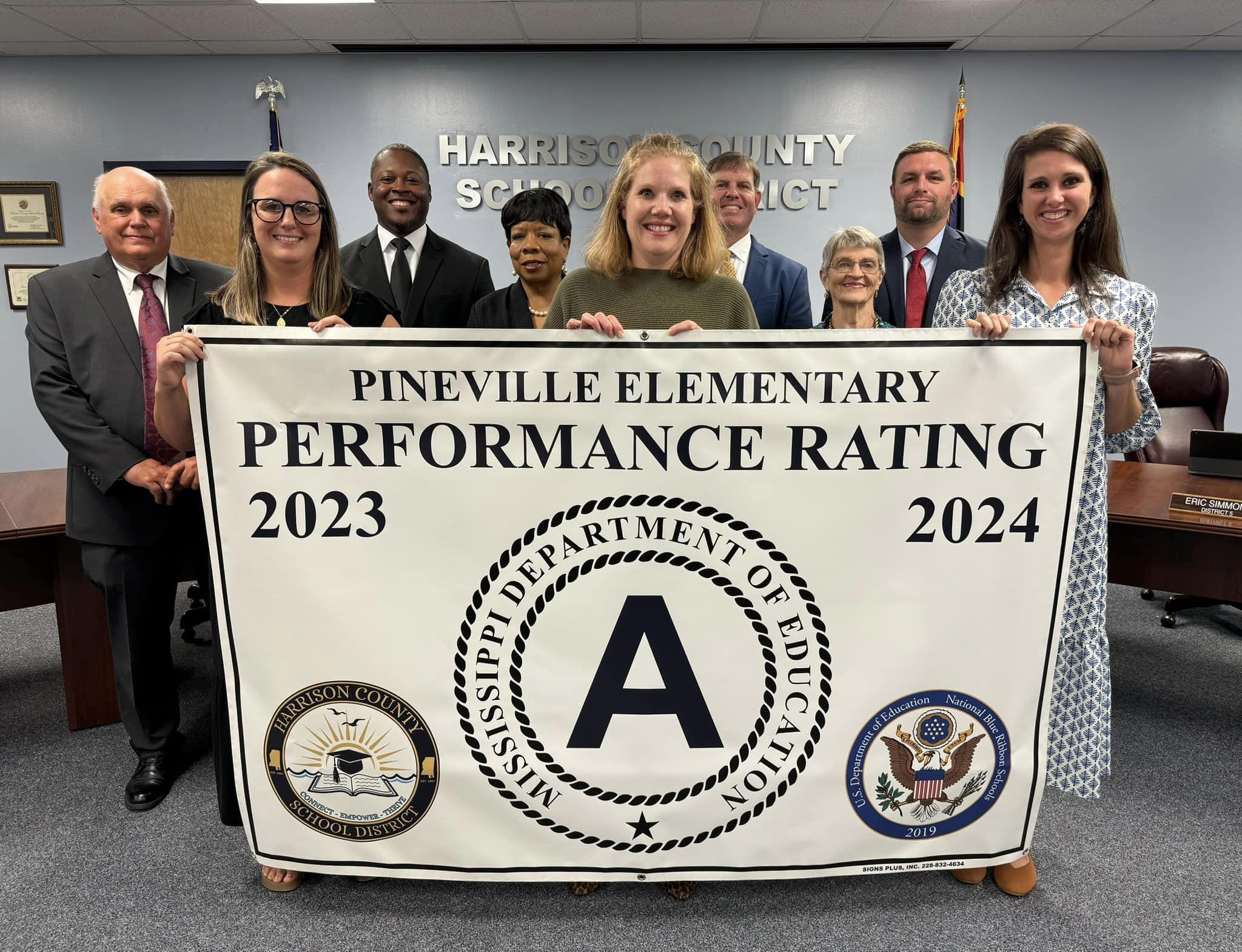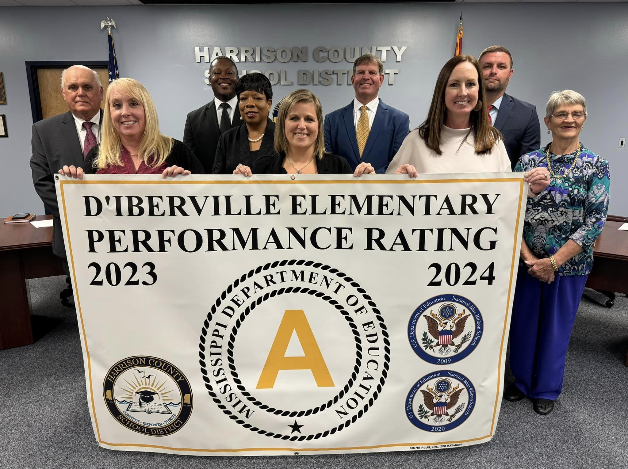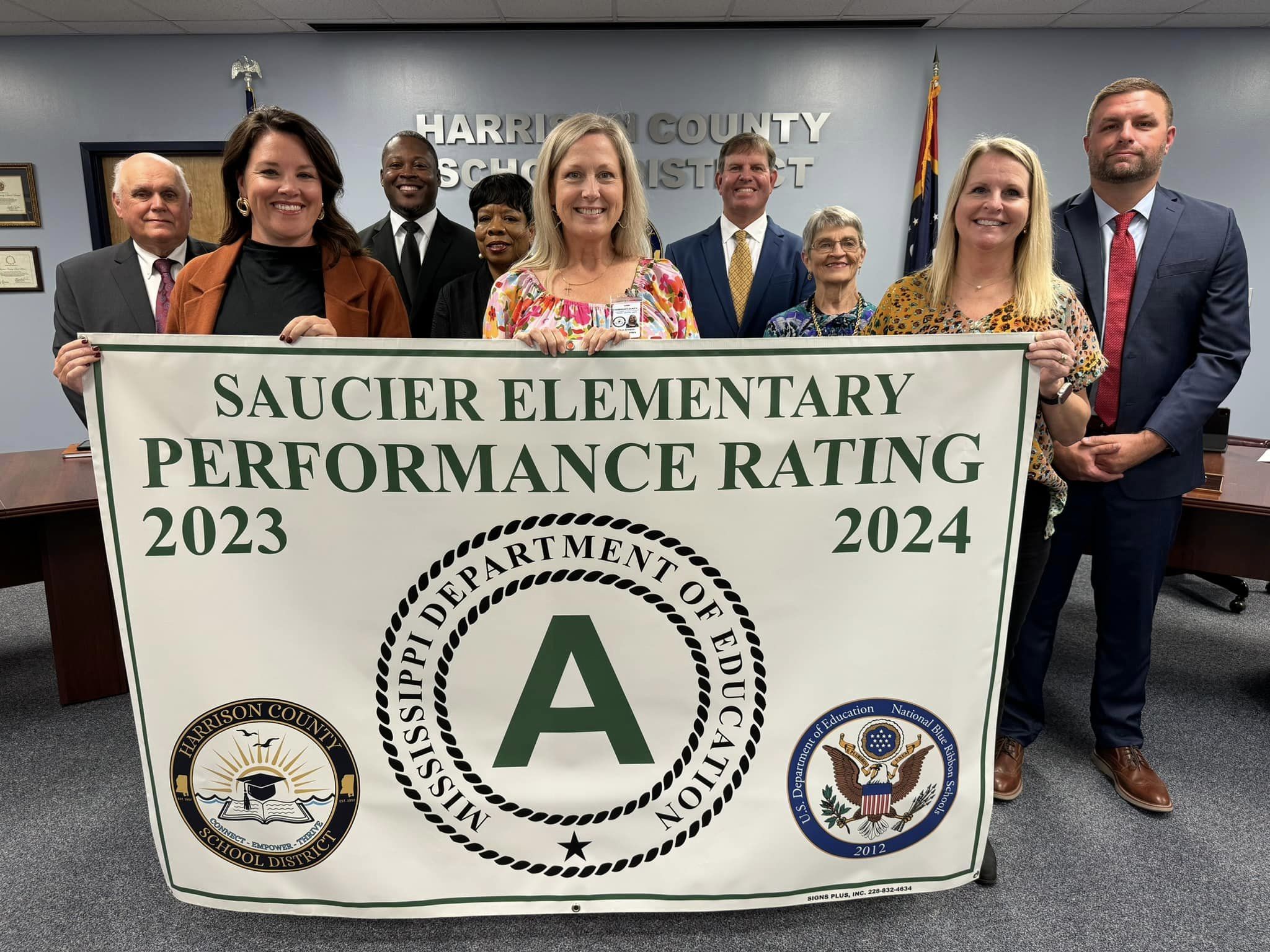 (November 4, 2024)—Tonight, the Harrison County School Board recognized the remarkable achievements of 14 schools that achieved “A” performance ratings and five schools that earned “B” ratings from MDE during the 2023-24 school year. Board members and district administrators presented custom-designed banners to those outstanding schools to proudly display on their campuses.