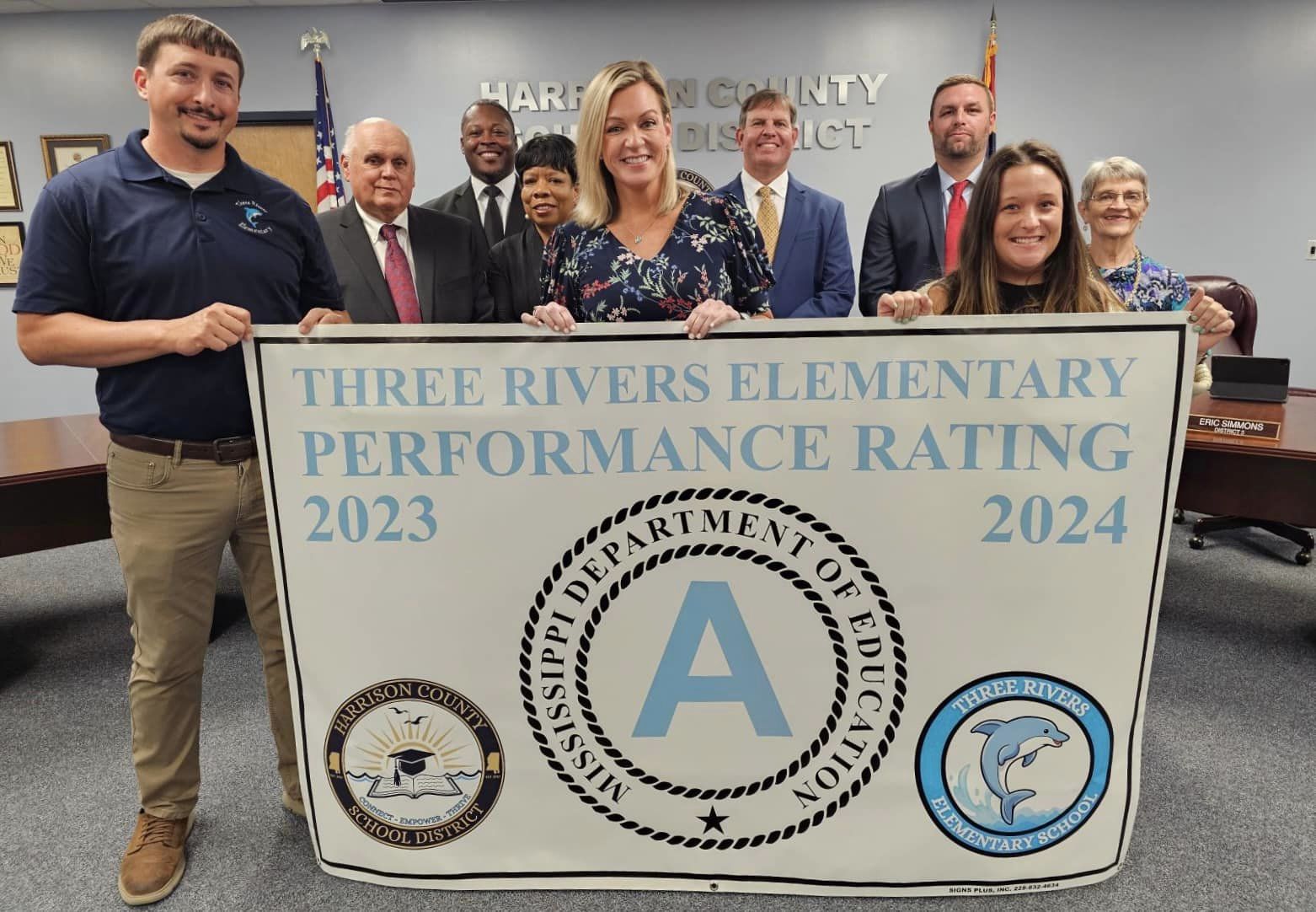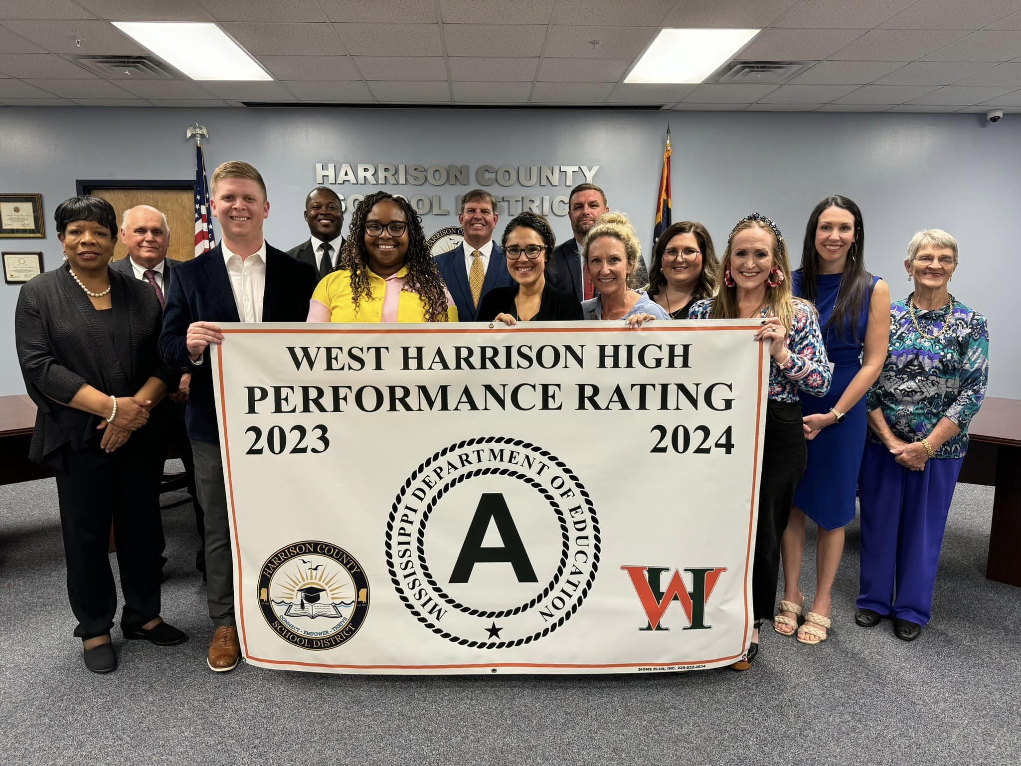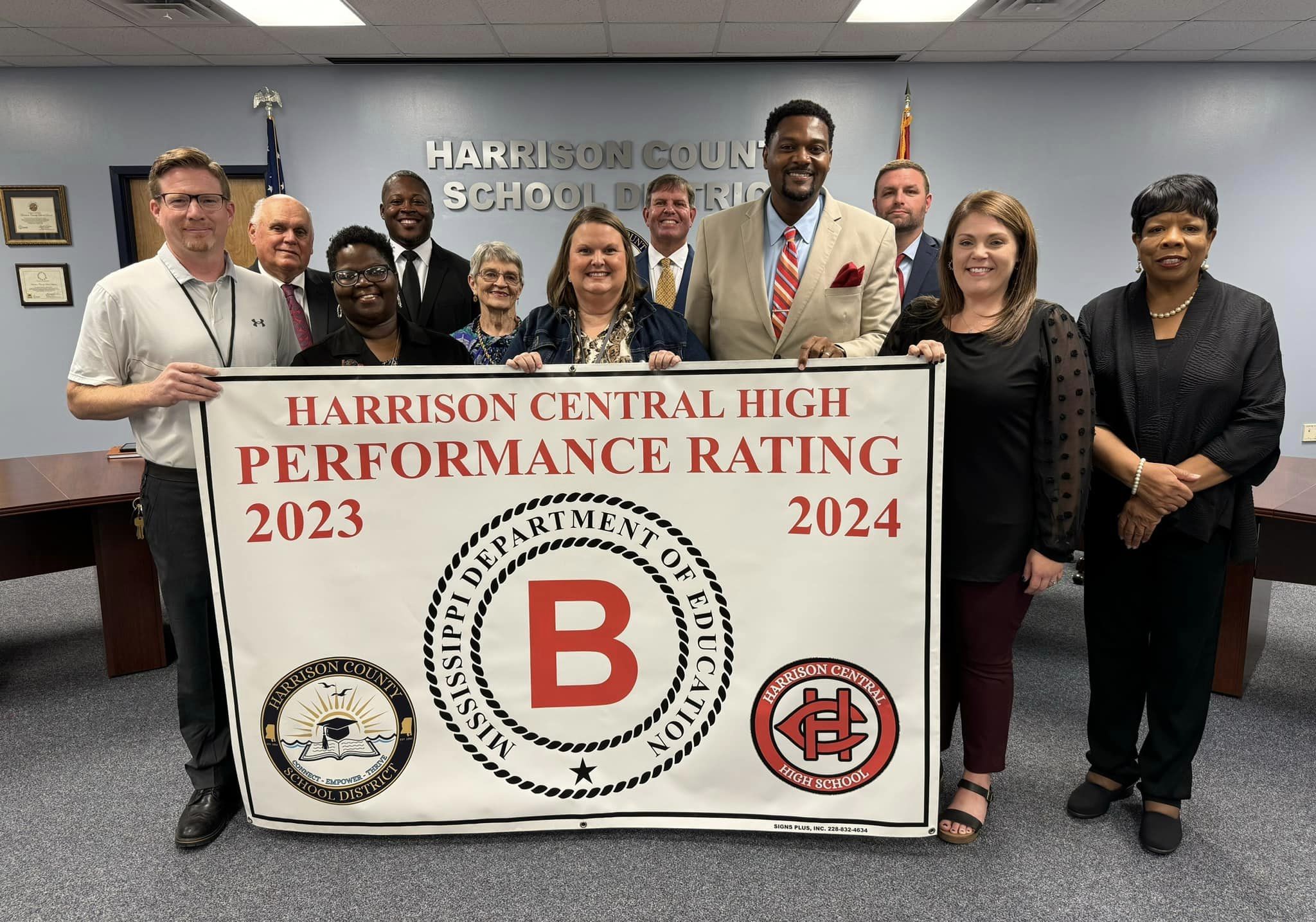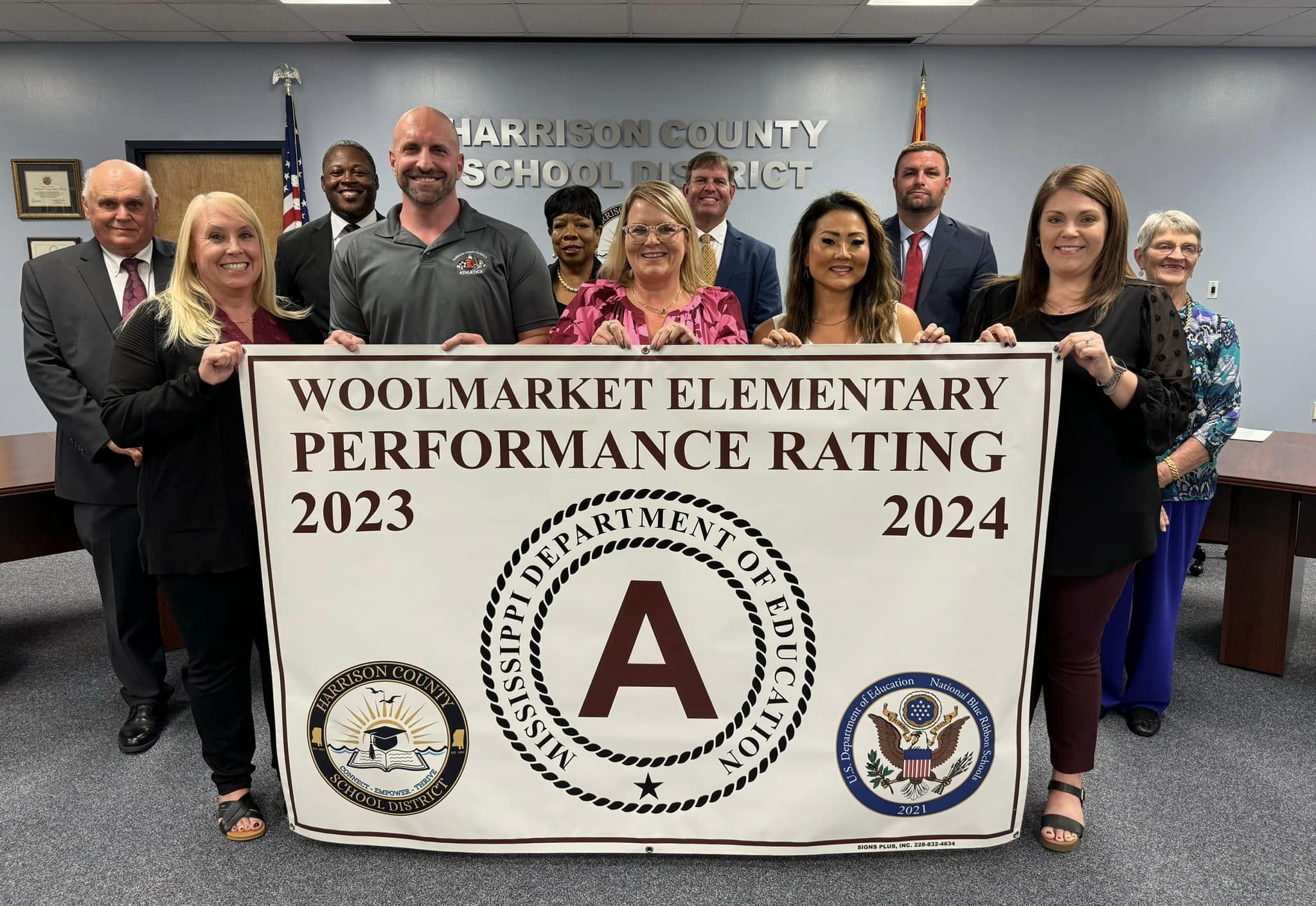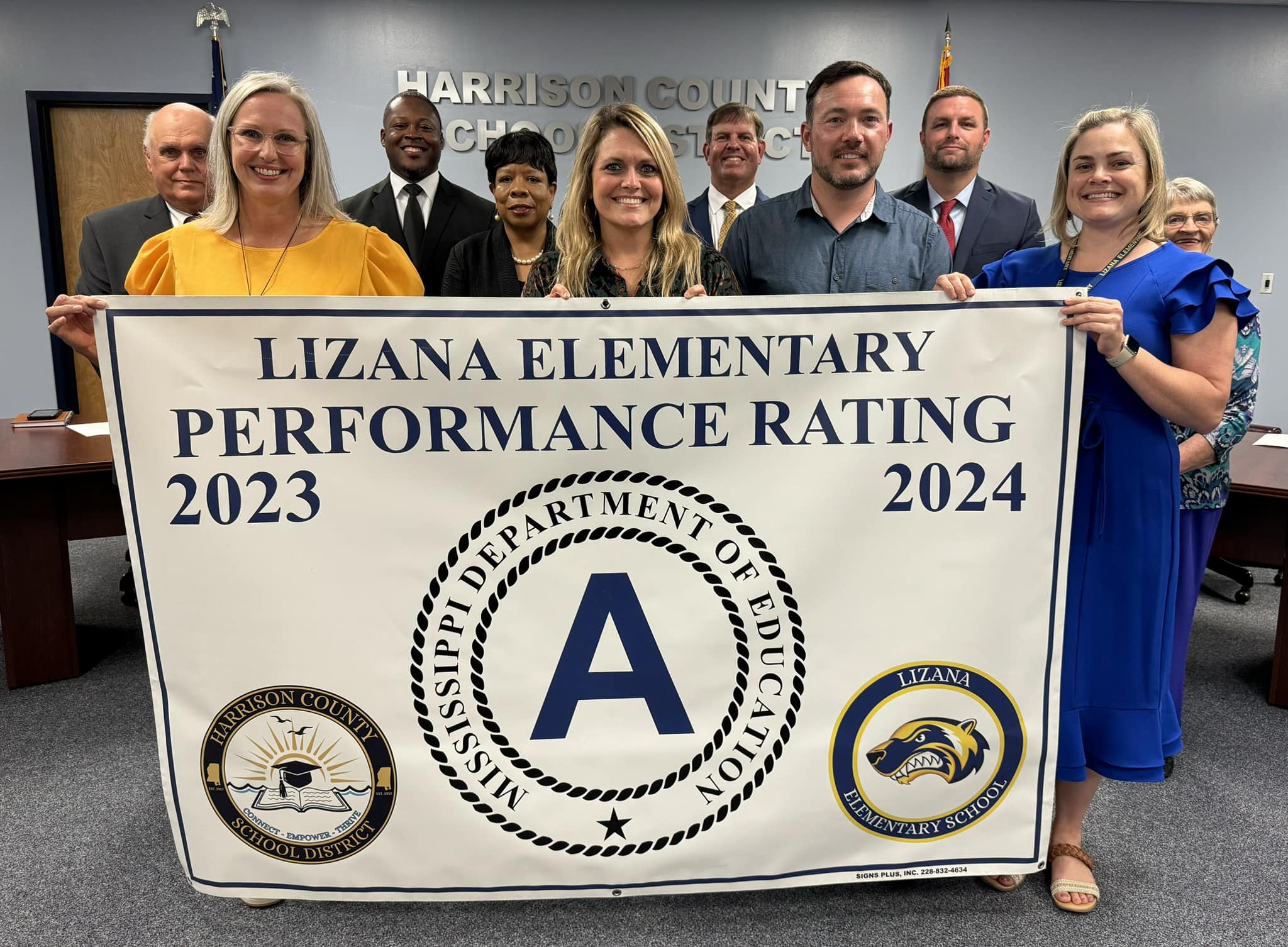 (November 4, 2024)—Tonight, the Harrison County School Board recognized the remarkable achievements of 14 schools that achieved “A” performance ratings and five schools that earned “B” ratings from MDE during the 2023-24 school year. Board members and district administrators presented custom-designed banners to those outstanding schools to proudly display on their campuses.