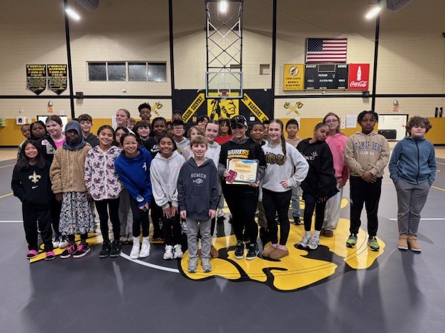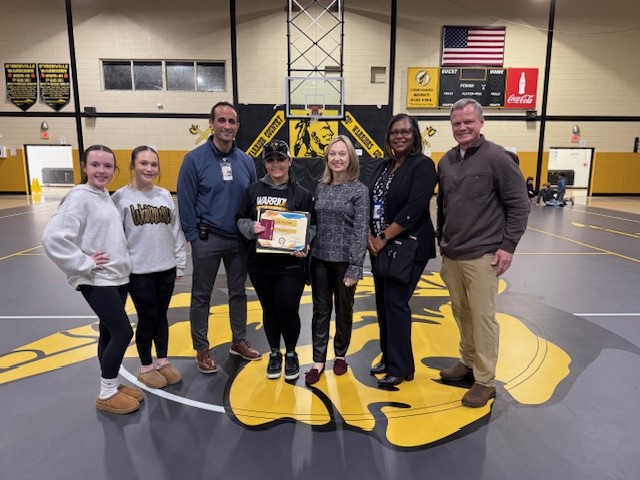 (December 13, 2026) – The D'Iberville Middle School gym provided the perfect place to surprise PE teacher Becky Hasse! This morning, we dropped by DMS to celebrate Coach Hasse as our December District Staff of the Month winner! Our education partner, Guild Mortgage Gulfport, presented our honoree with a certificate, a $100 restaurant gift card, and a box of Mardi Gras-themed cookies.